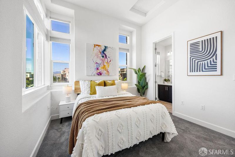 Built in 2015, this bright corner tri-level townhome-style condo offers 2 bedrooms, 2.5 bathrooms and 1,251 sqft of well-designed living space. Expansive windows bring in natural light, complemented by recessed lighting and central A/C. A private entry leads to an attached 2-car garage with built-in storage. The main level features open-concept living with a modern kitchen complete with a large granite island, wood cabinetry, tile backsplash, stainless steel appliances, gas cooktop, and pantry, plus a convenient half bath. Upstairs, both bedrooms offer ensuite privacy, including a primary suite with a walk-in closet. A laundry closet with a stackable washer and dryer adds everyday ease. Ideally located near shopping, dining, parks, and trails, with easy access to Dublin/Pleasanton BART Station, H Mart, Whole Foods Market, Target, Costco, and easy access to Highways 580 and 680. This home blends comfort, convenience, and modern living.