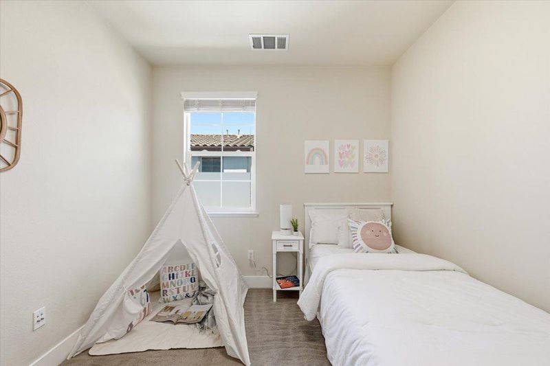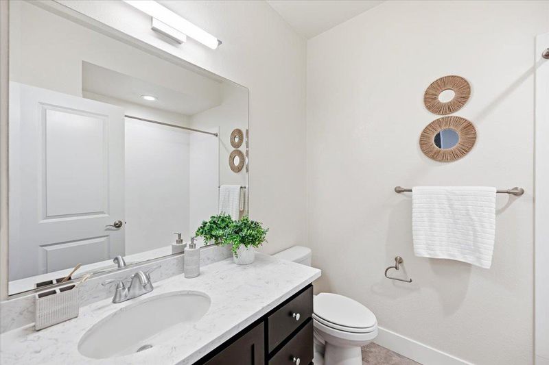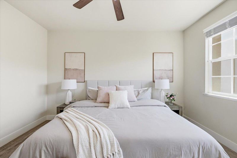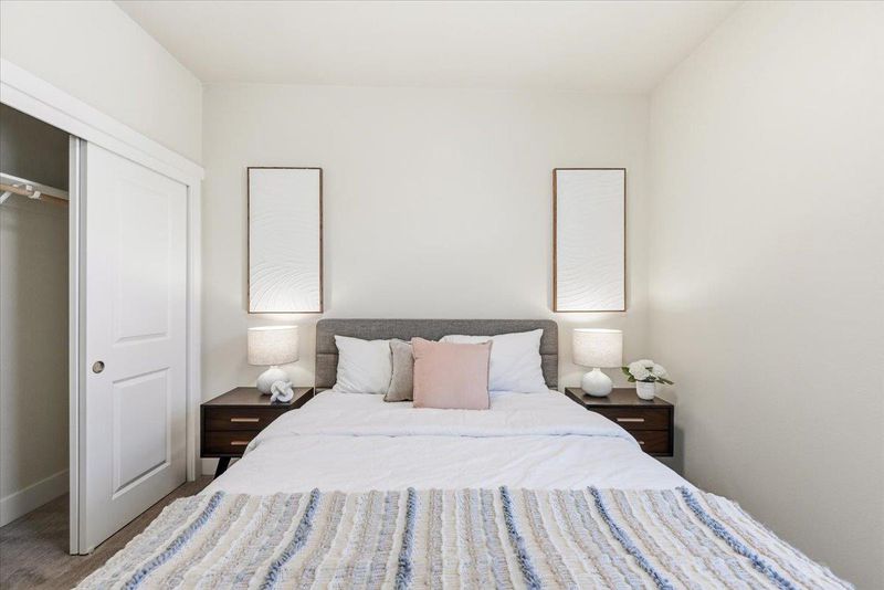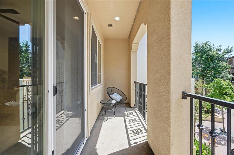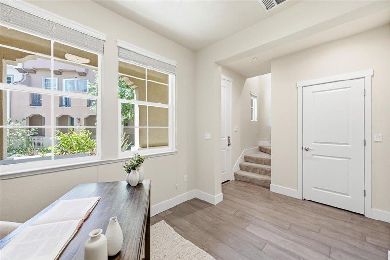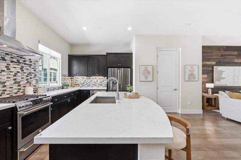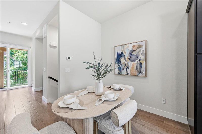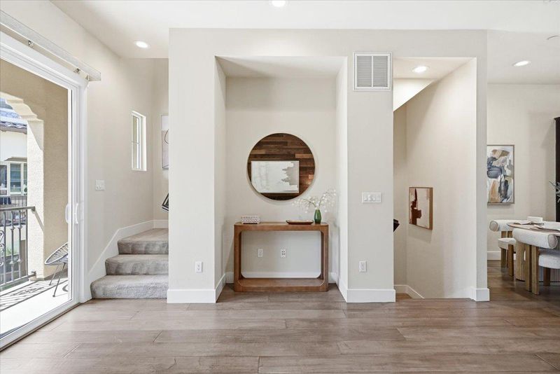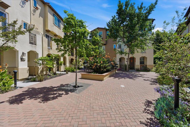 Beautifully appointed 3-bedroom townhome with a versatile bonus room, ideally situated on a premium lot within a serene, private courtyard surrounded by lush greenery. this residence showcases thoughtful design and high-end upgrades throughout. The main level features a gourmet kitchen with a large center island, quartz countertops, full-height backsplash, stainless steel appliances, and abundant cabinetry seamlessly flowing into the open-concept living and dining areas. Elegant hardwood flooring and a stylish wood accent wall add warmth and character. Enjoy indoor-outdoor living with a private balcony overlooking tranquil garden views. Upstairs, the spacious primary suite offers a walk-in closet, dual-sink vanity a large shower, accompanied by two well-proportioned secondary bedrooms.The ground-level bonus room provides exceptional flexibility perfect as a guest suite, home or office. Additional highlights include HVAC,Hunter Douglas ® blinds throughout, a side-by-side two-car garage. Low HOA dues cover building insurance, garbage ,water and community amenities. Ideally located near Downtown Sunnyvale, Caltrain, and major tech campuses, Convenient Google & Meta shuttle stop just downstairs, this home delivers the perfect blend of comfort, convenience, and exceptional value.