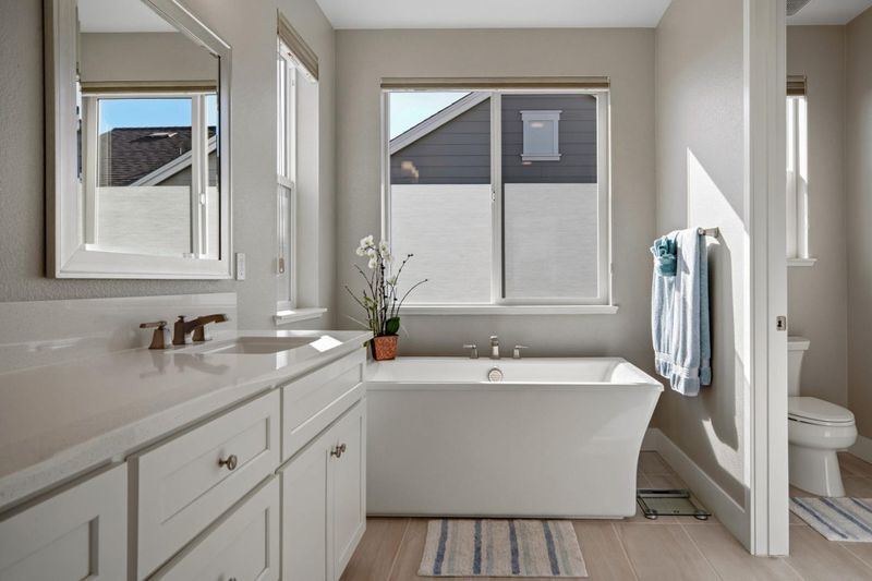 - Double Sinks, Dual Flush Toilet, Half on Ground Floor, Primary - Oversized Tub, Primary - Stall Shower(s), Shower over Tub - 1, Tile