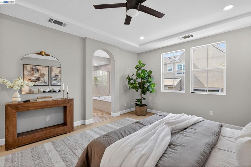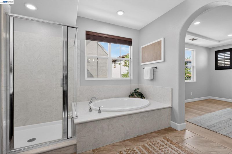 Many upgrades—perfect move-in ready home. Largest home in the Gale Ranch Iriana neighborhood, featuring the best-looking elevation with a balcony. Excellent location—walk to all 3 top San Ramon schools. Well-connected downstairs layout with a living room featuring a fireplace, separate dining area, butler’s pantry, powder room, and gourmet kitchen with extended counters, cabinets, island seating, breakfast nook, gas range, stainless appliances, and granite countertops, plus a family room with a media niche. Upstairs features a primary bedroom with a lavish bath and walk-in closet; bedroom 2 is currently used as a retreat; bedroom 3 includes an attached bath suite and balcony; bedrooms 4 and 5 share another common bathroom; and there is convenient upstairs laundry with cabinetry. Check optional idea picture to add 1 more bed, 1 full bath downstairs. $100K+ in upgrades. Owned solar system, water softener, purifier, fans in all rooms, and a finished garage with designer flooring, storage cabinets, and Tesla EV charger. Landscaping includes pavers in the back and side yards. Well-cared-for home with brand-new upgrades, including top-quality luxury vinyl flooring with soft underlayment, moldings, taller baseboards, new interior paint, modern electrical ceiling lights with night light feature, modern vanity lights and fixtures, new fence paint, and more. Low HOA dues, well-maintained Mosaic community rec center, clubhouse, two pools (large pool and children’s wading pool), and numerous parks and trails nearby. Open Fri, Sat & Sun.