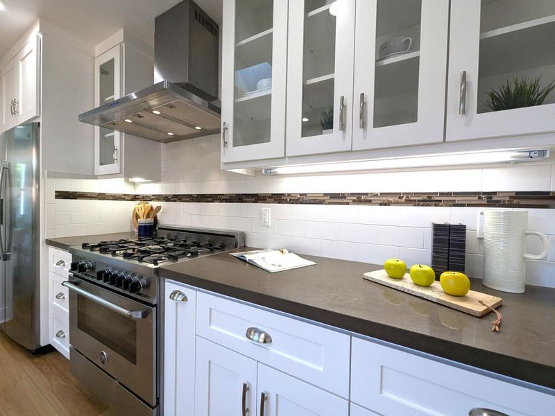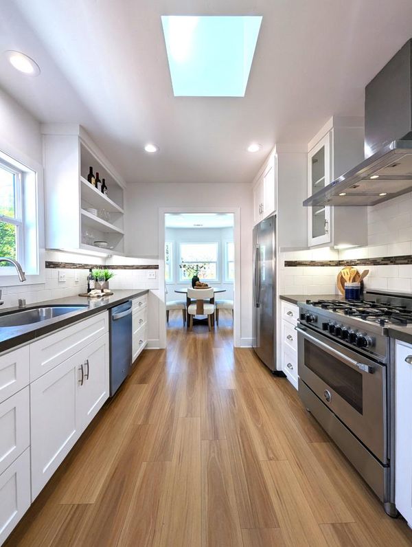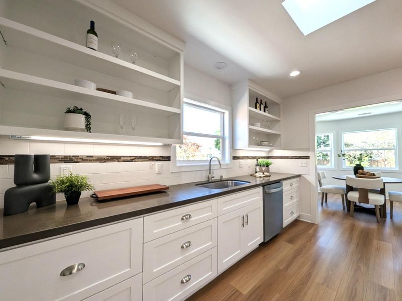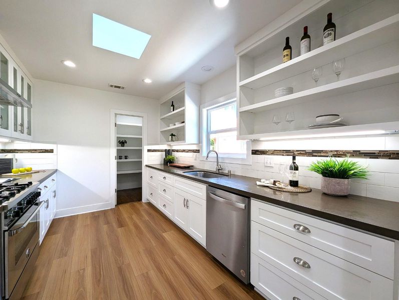 Countertop - Quartz, Dishwasher, Exhaust Fan, Hood Over Range, Oven - Gas, Oven Range - Gas, Pantry, Refrigerator, Skylight