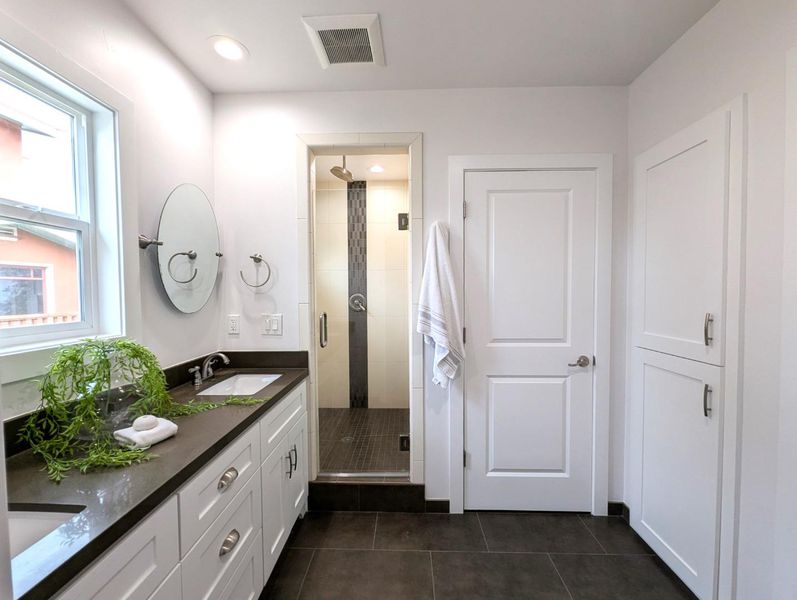 Double Sinks, Primary - Stall Shower(s), Shower and Tub, Tile, Updated Bath